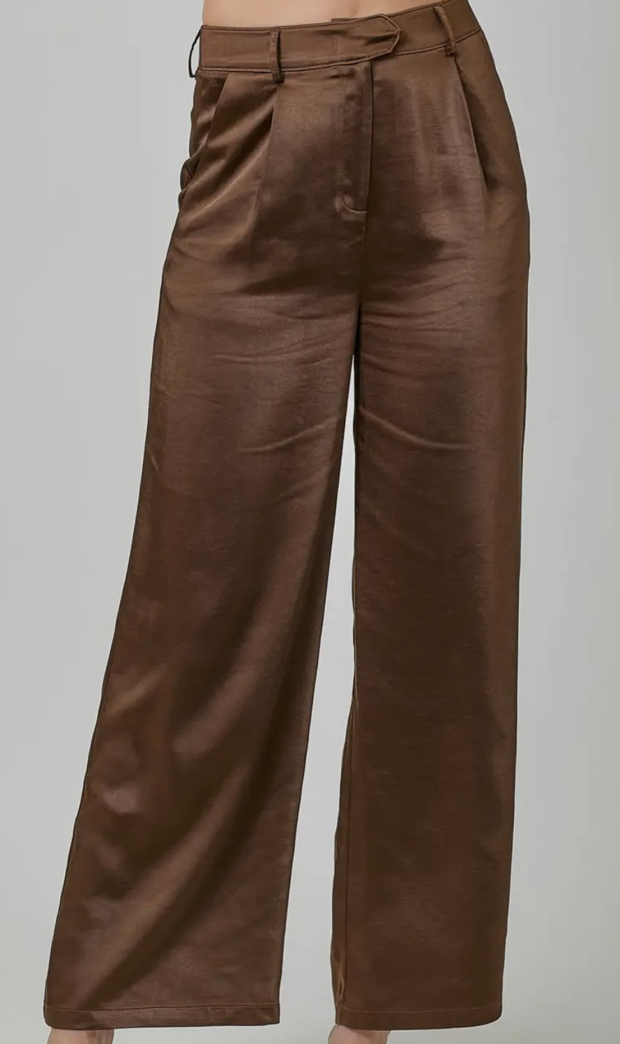 These satin pants combine elegance with comfort, featuring a secure button, hook, and zipper closure for a polished fit. Designed with practical side pockets and a wide-leg silhouette, they offer both functionality and a flattering drape, ideal for sophisticated styling.