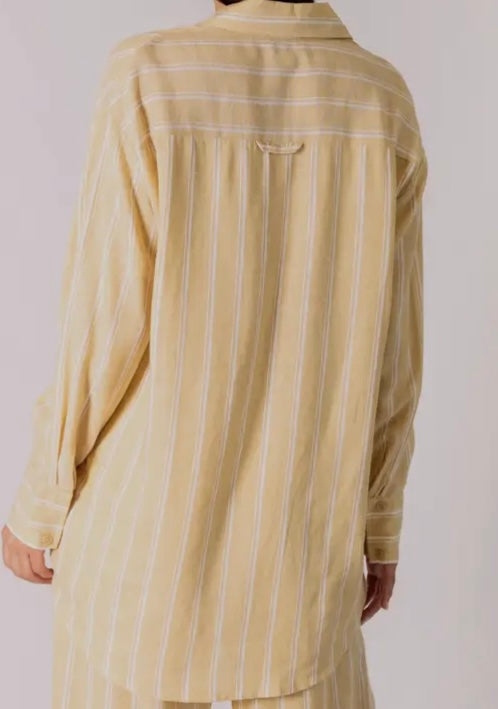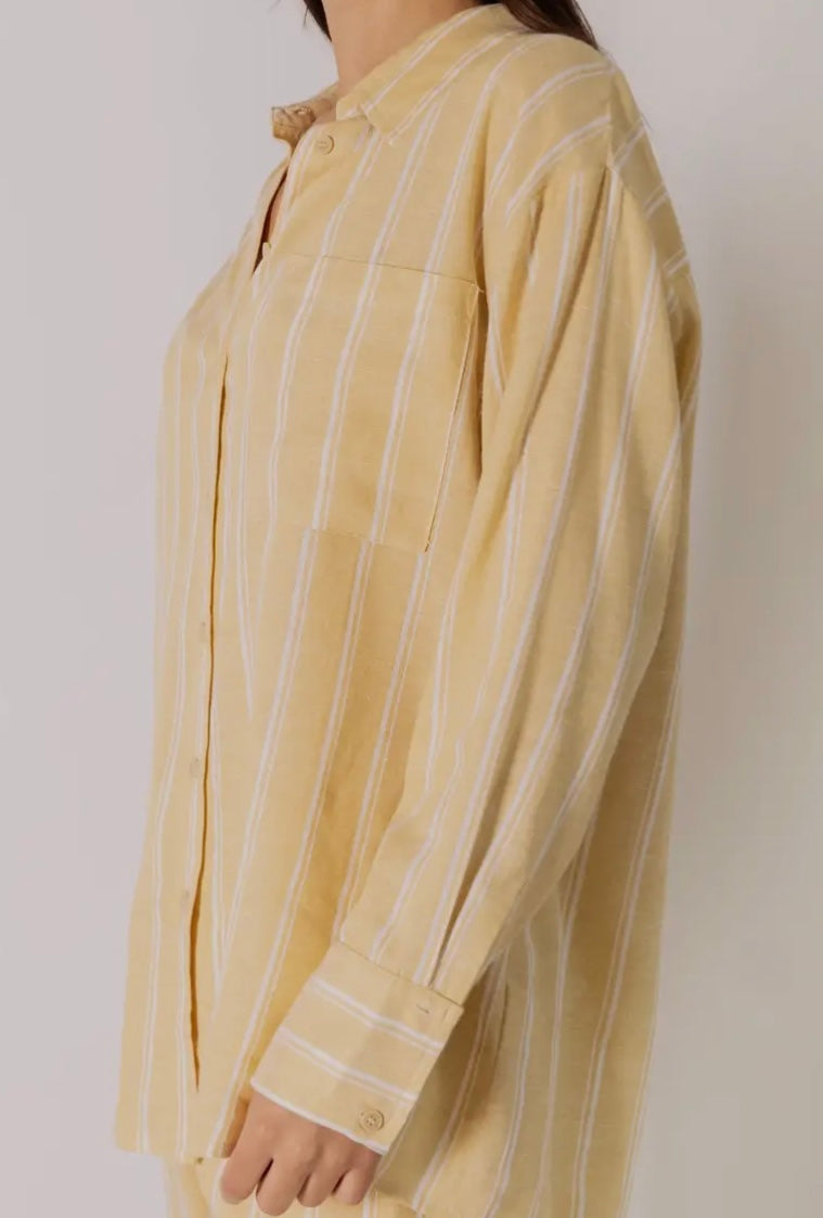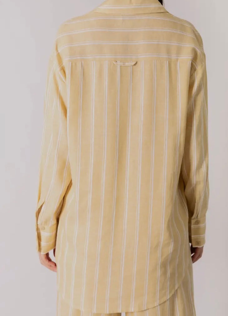 This button-up shirt is crafted from a striped linen blend for a crisp yet effortless feel. Dropped shoulders and a relaxed silhouette bring ease to tailored structure, while the classic stripe print adds timeless appeal. Details: