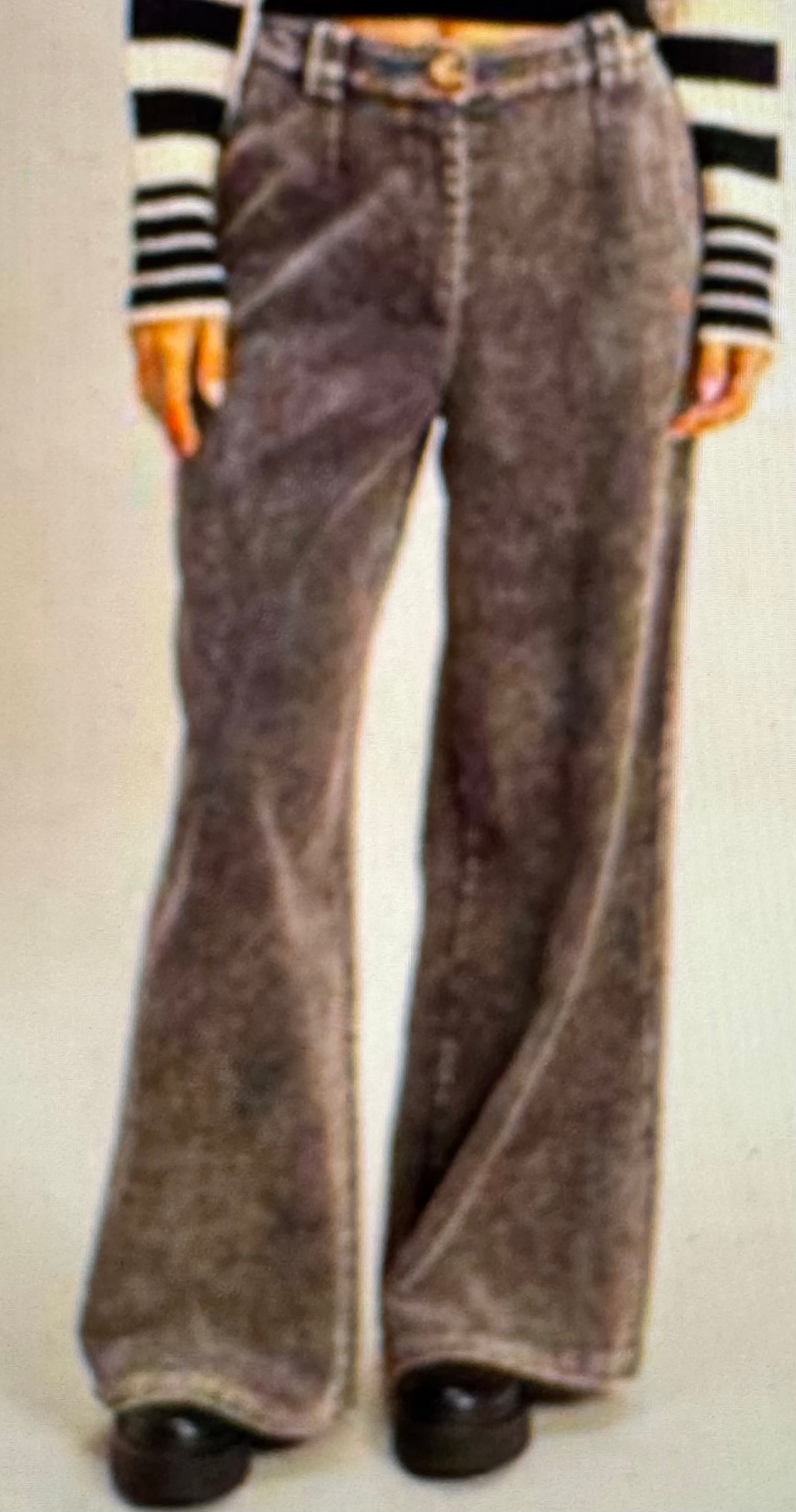 These charcoal corduroy pants feature a snow-washed fabric that offers a soft, lived-in feel. Designed with a wide-leg silhouette, they provide both comfort and a modern look. The zip front ensures a secure fit, while the elastic back waistband adds flexibility for all-day wear. Ideal for those seeking a blend of style and practicality in their wardrobe.