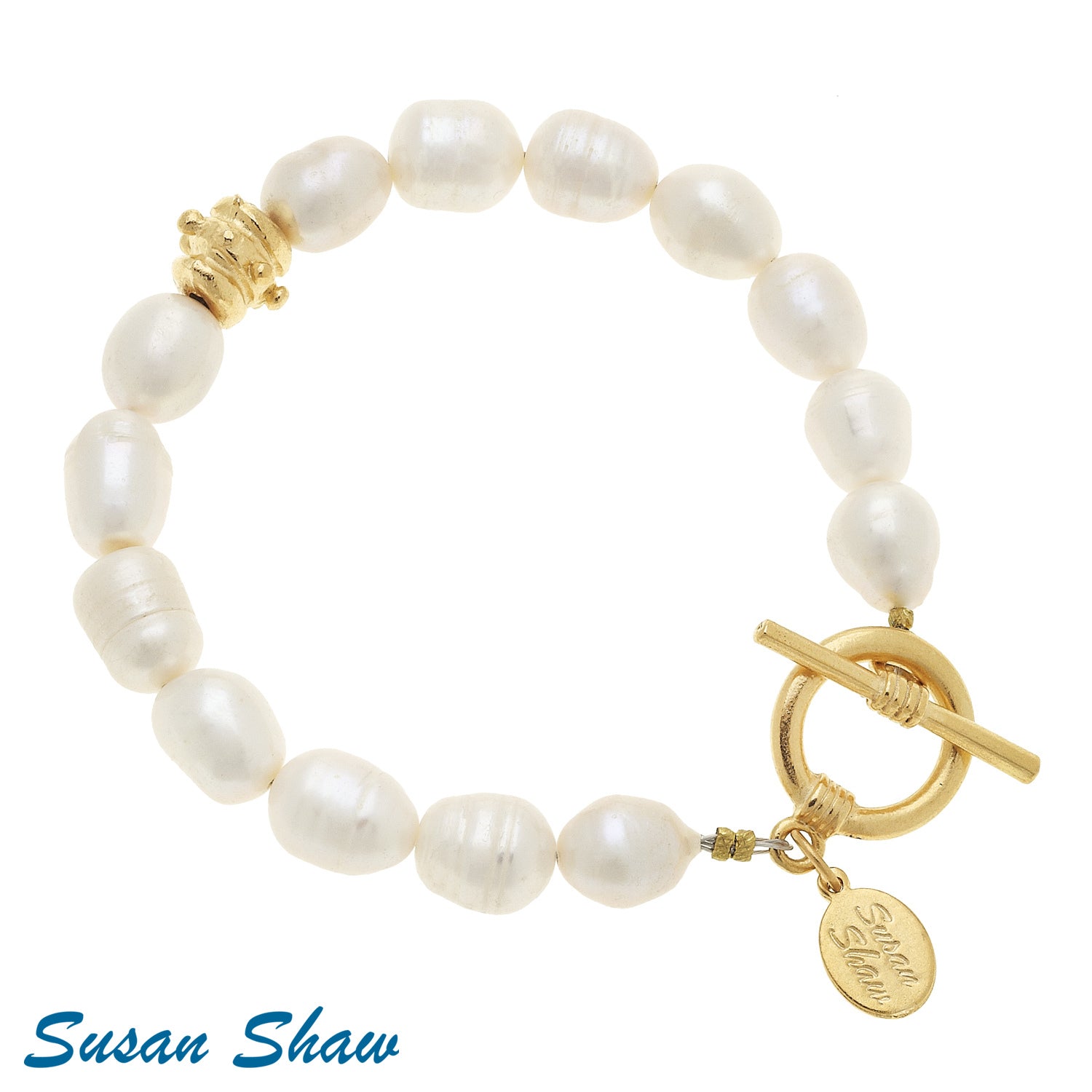 This Classic Pearl Bracelet showcases genuine pearls, each uniquely formed to highlight natural beauty. Handmade by Susan Shaw in the USA, it features a secure toggle clasp and delicate gold bead accents, combining expert craftsmanship with timeless elegance. Ideal for adding a sophisticated touch to any ensemble.