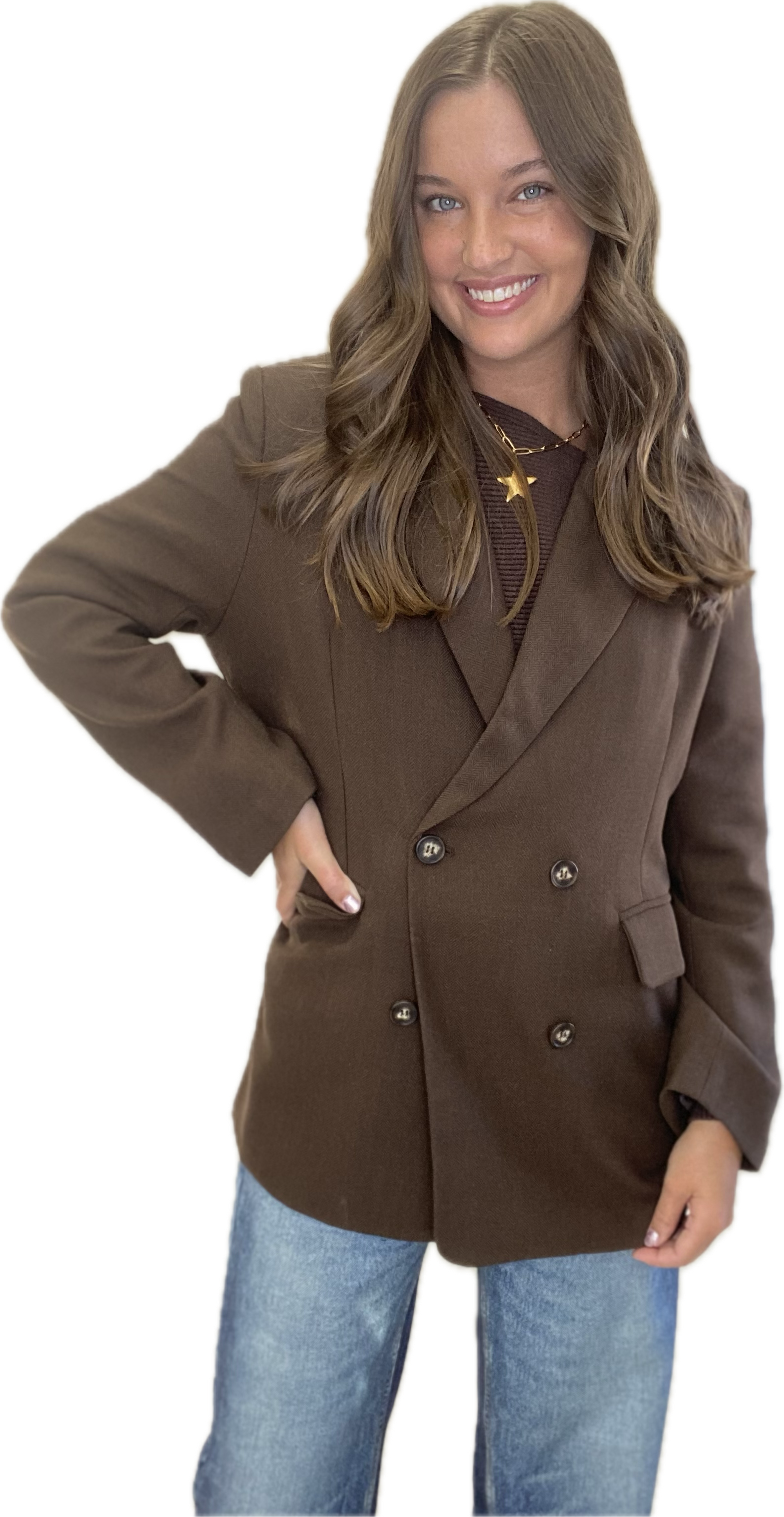 This double-breasted blazer features a structured silhouette and classic lapels, offering a refined and polished appearance. Its distinctive button closure enhances the tailored fit, making it an ideal choice for a sophisticated casual or professional wardrobe.