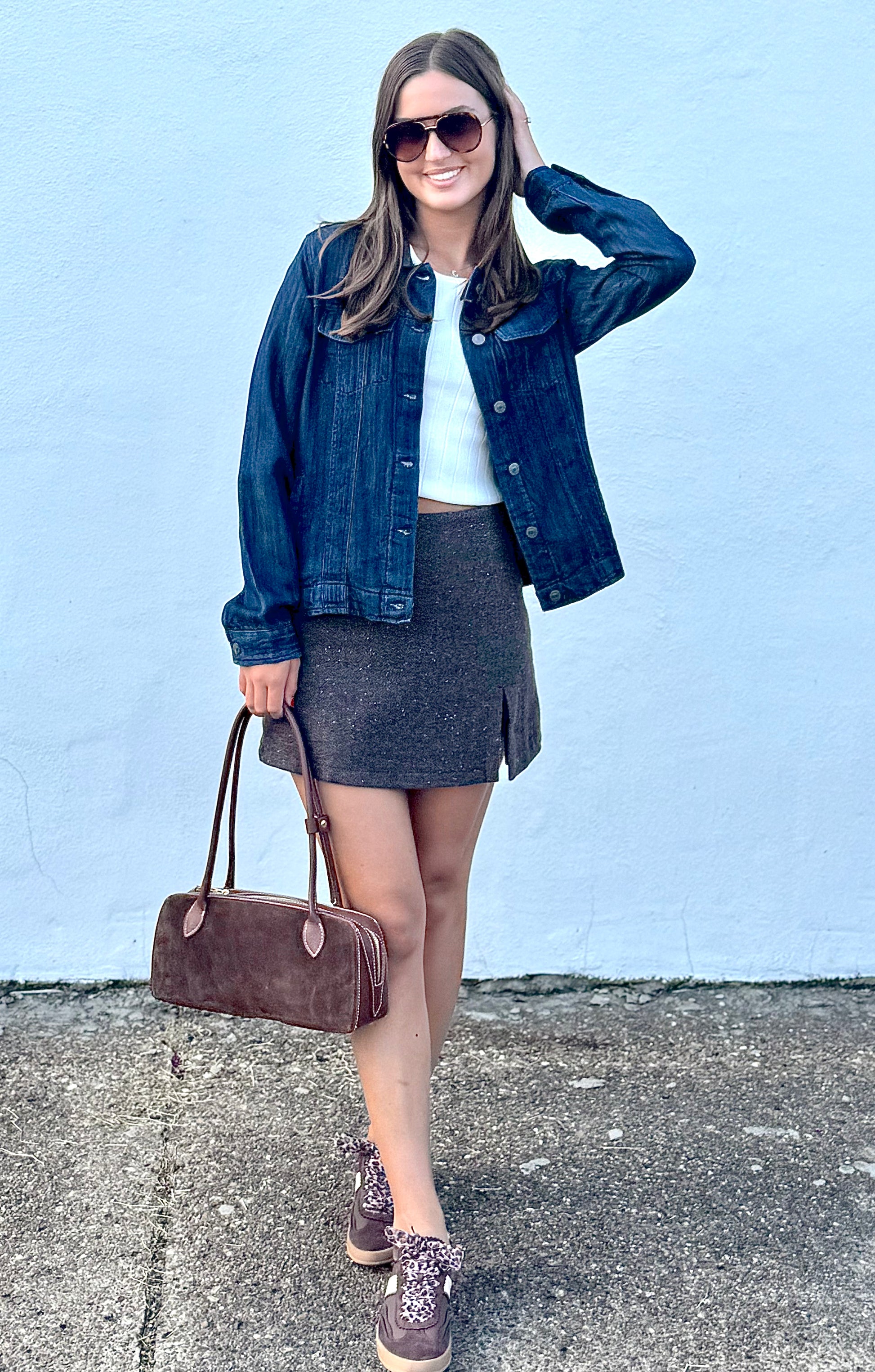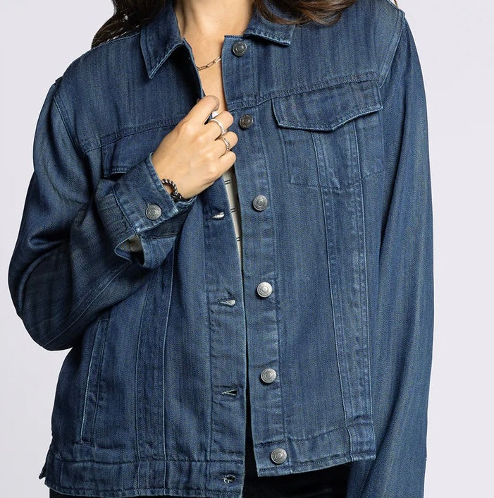 The Jackie Jacket features a classic button front closure and practical side pockets, combining functionality with style. Crafted in dark wash denim, this relaxed-fit jacket offers a comfortable yet polished look, ideal for layering in various seasons. Its timeless design ensures versatility for both casual and elevated outfits.