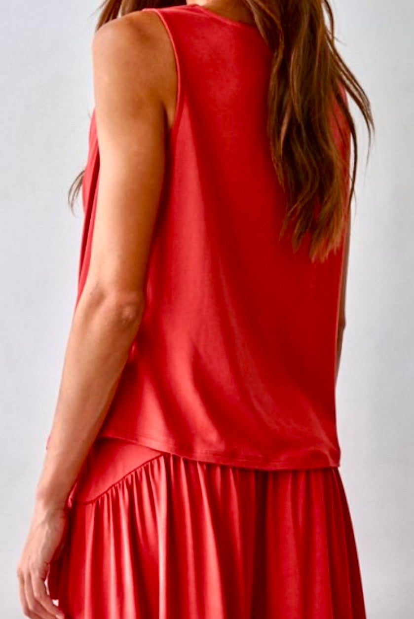 Elevate your wardrobe with this sophisticated sleeveless cowl neck top, crafted from a premium knit blend of polyester and spandex. The luxurious drape of the cowl neckline creates an elegant silhouette, while the stretchy fabric ensures a comfortable, flattering fit that moves with you. The rich dusty red hue offers versatile styling options for both professional and casual occasions. Pair it with the matching pants for a coordinated, polished ensemble that exudes refined elegance.