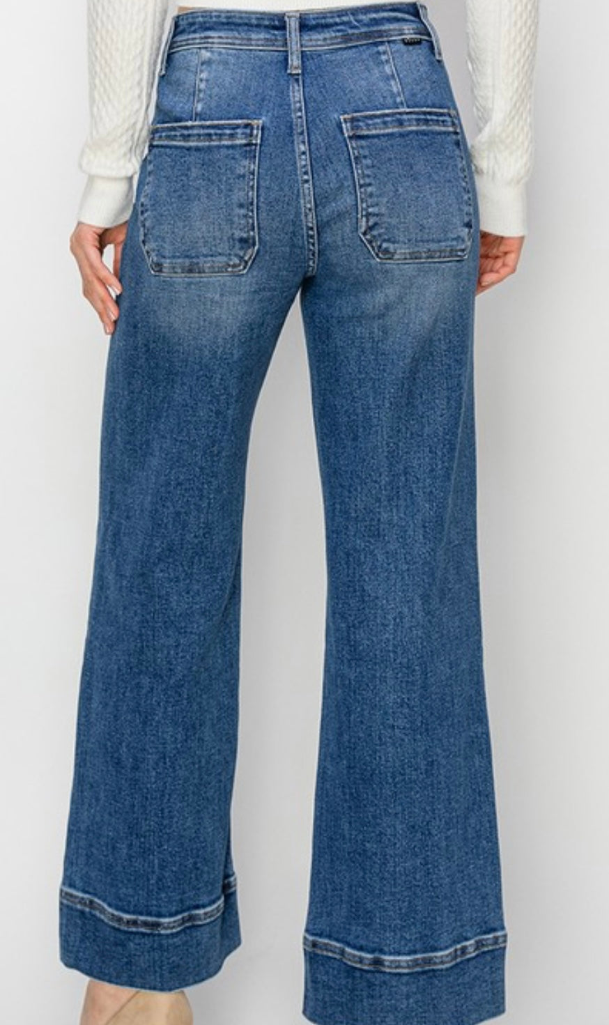 These medium wash high-rise crop wide jeans combine contemporary style with comfort. Designed to sit at the natural waist, they offer a flattering silhouette while the cropped wide leg provides a modern, relaxed fit. Perfect for pairing with both casual and dressier tops, these jeans deliver versatile wearability and timeless appeal.