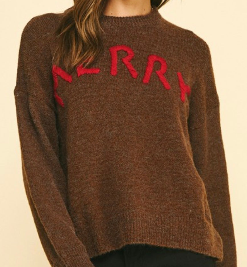 Elevate your seasonal wardrobe with this expertly crafted sweater, featuring bold "MERRY" embroidered lettering in striking red against a rich brown base. The relaxed drop shoulder silhouette delivers contemporary comfort without compromising on style, while long sleeves provide practical warmth. The round neckline offers versatile styling options, making this piece an effortless addition to your everyday rotation. Perfect for layering or wearing solo, this sweater combines thoughtful design with quality construction for a polished look that transitions seamlessly from casual outings to relaxed gatherings.