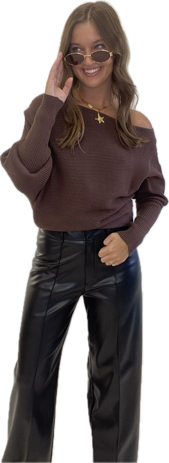 This ribbed dark chocolate sweater features a distinctive asymmetrical neckline that adds a modern touch to classic comfort. Its flattering fit contours the body gracefully, making it a versatile piece for both casual and refined looks. Crafted to combine style and subtle sophistication, this sweater is an essential addition to any expert wardrobe.