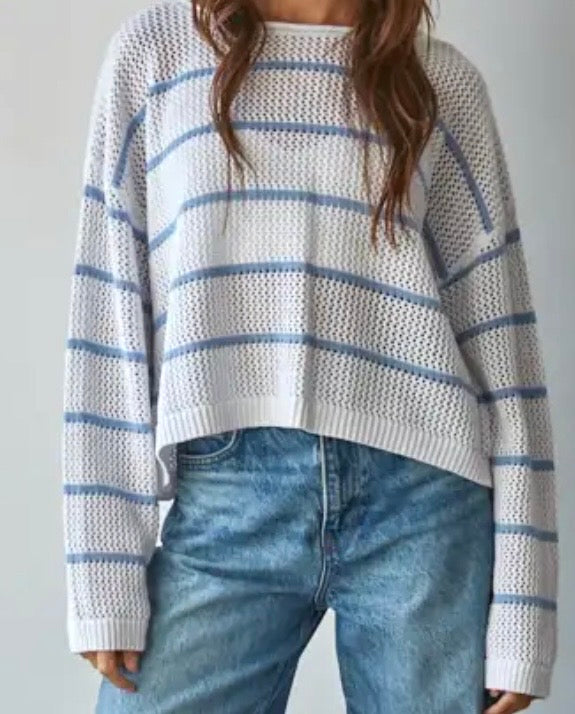 Crafted from a premium knit blend of cotton and acrylic, this open weave striped sweater delivers exceptional comfort and durability. The classic round neckline and long sleeves provide timeless versatility, while the crisp white base with light blue stripes creates a refined, understated aesthetic. The breathable fabric ensures all-day wearability, making it an essential layering piece for any wardrobe. Perfect for casual outings or elevated everyday styling.