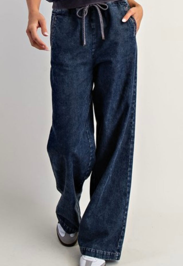 These relaxed fit denim pants combine comfort and style with their wide leg silhouette and soft cotton fabric designed to mimic classic denim texture. The contrast knit waistband and drawstring offer adjustable ease, while front slash pockets and two back patch pockets provide practical storage. Ideal for a laid-back yet polished look, these pants balance casual appeal with expert craftsmanship.